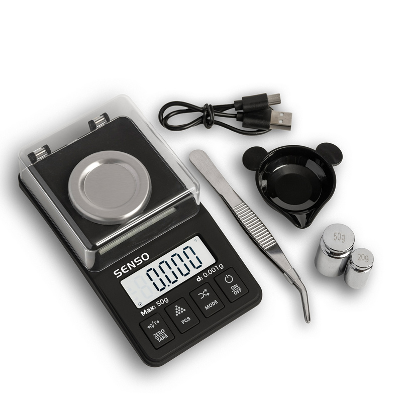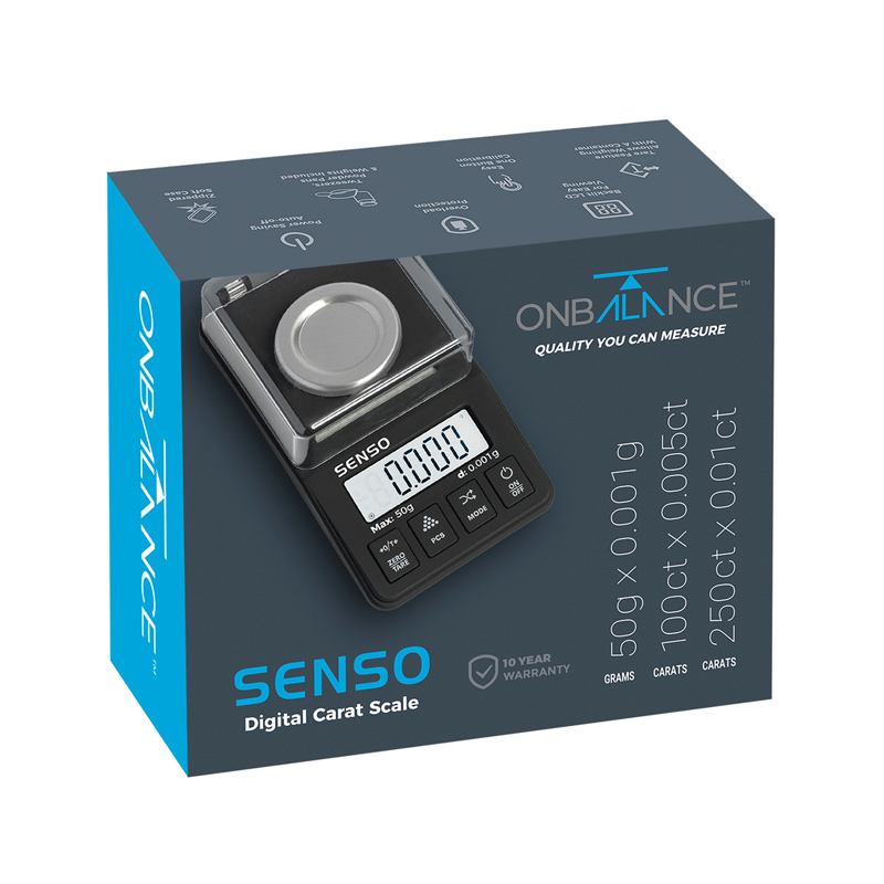 Professionelle, kompakte und tragbare OnBalance Karatwaage Senso inkl. Edelsteinschale, Pinzette, Kalibriergewichte (20g und 50g), USB Netzstecker (Typ C), Hardschalenetui und Batterien. Ein Hartschalen-Case ist im Lieferumfang ebenfalls enthalten