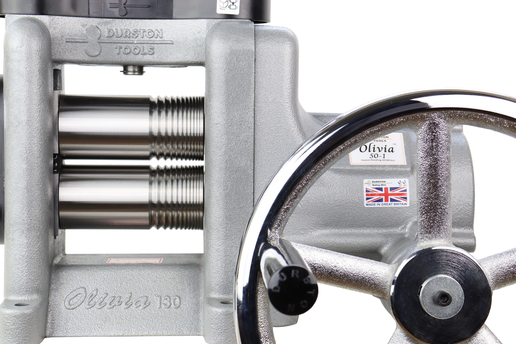 Das 50-1-Getriebe macht das Auswalzen von Material sehr viel einfacher. - Es sind 50 Umdrehungen des Handrads erforderlich, um die Rollen einmal zu drehen. Das Getriebe und das Handrad sind so konzipiert, dass sie zusammenwirken, um das Walzen so viel einfacher zu machen. Dank des speziell entwickelten und zum Patent angemeldeten Getriebes und der Schwungkraft des Handrads können Sie dieses bis zu 10-mal so schnell drehen wie ein Standardwalzwerk mit einer 4-1 Untersetzung.